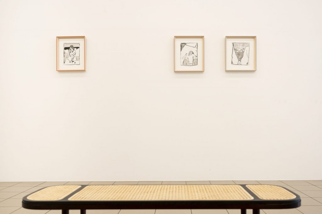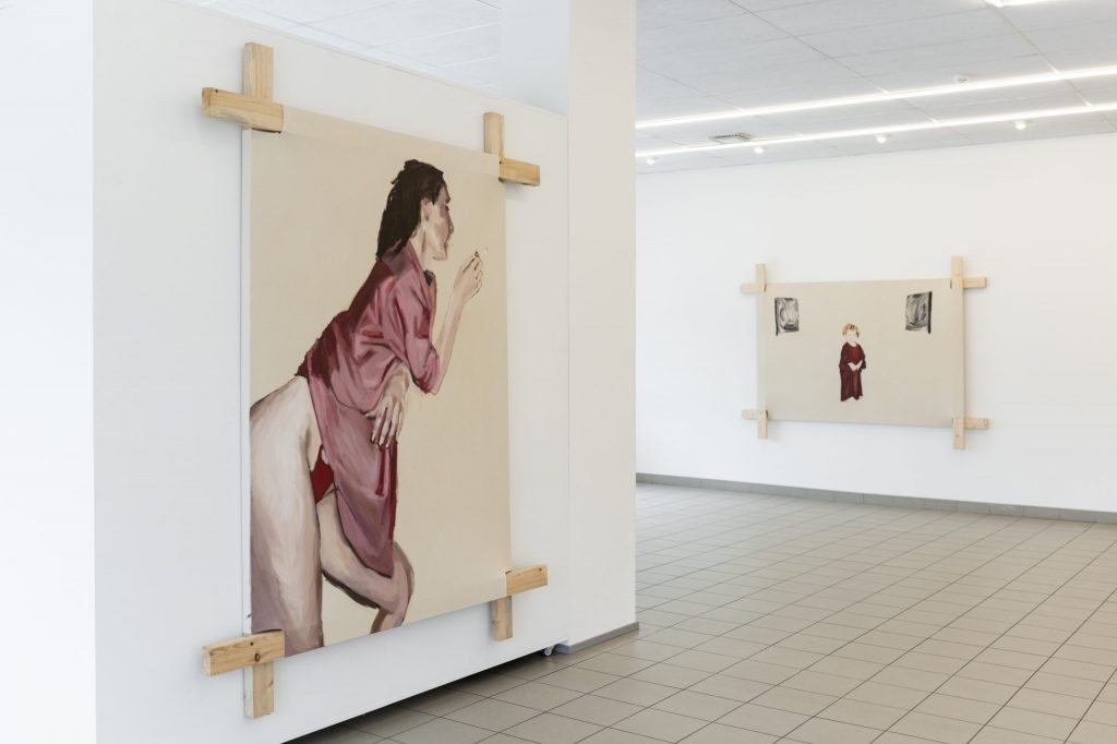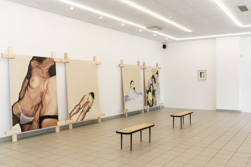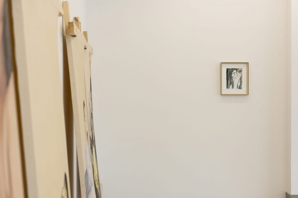 Thus, this exhibition is like a kind of tightrope walk. “In our time, love letters were no longer sent” draws on motifs from Polaroids taken during the artist’s late teenage years. Playful experiments with friends, fully made up in the bathtub, a pillow shyly grabbed as a cover — these images try to give a glimpse into moments where one thinks they’ve grown up, but in reality, they are just learning how to exist.