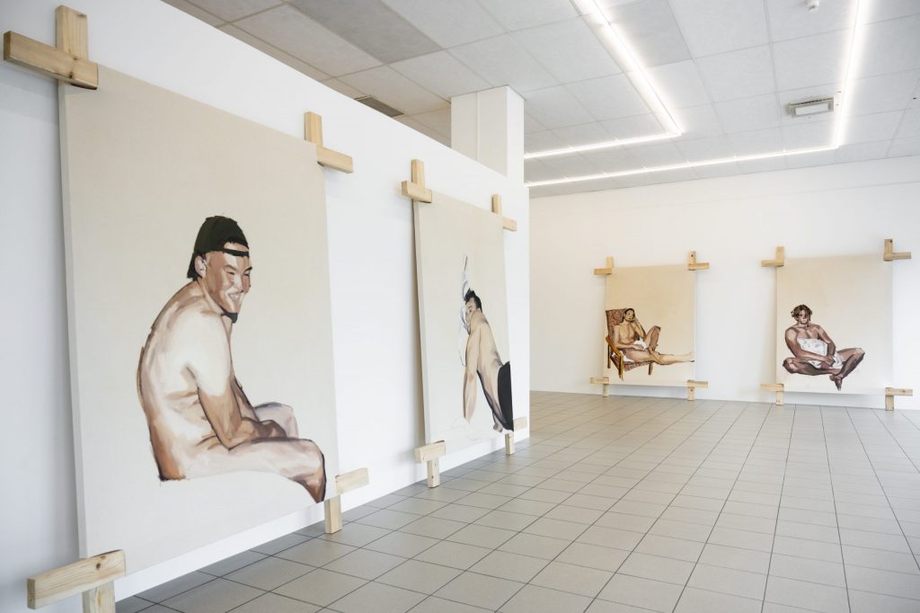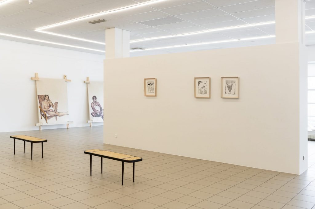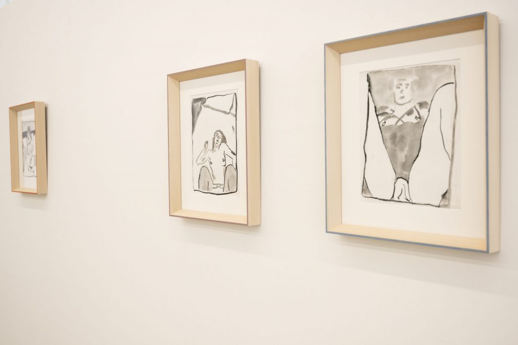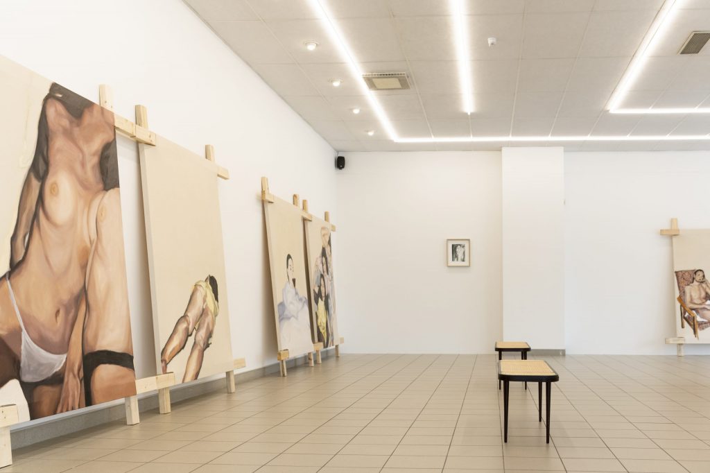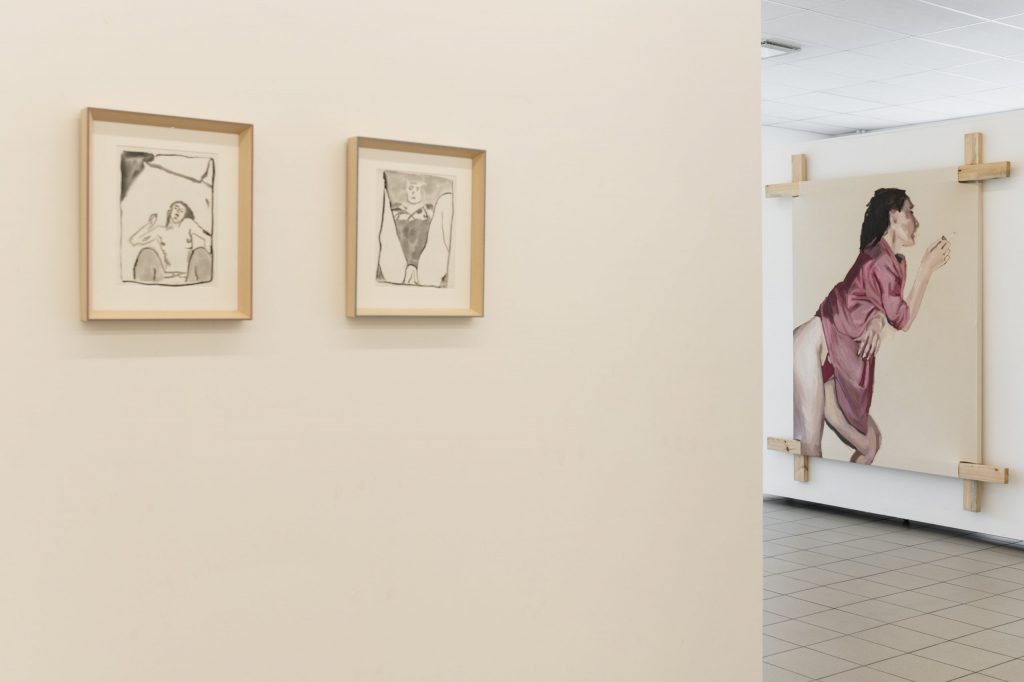 Thus, this exhibition is like a kind of tightrope walk. “In our time, love letters were no longer sent” draws on motifs from Polaroids taken during the artist’s late teenage years. Playful experiments with friends, fully made up in the bathtub, a pillow shyly grabbed as a cover — these images try to give a glimpse into moments where one thinks they’ve grown up, but in reality, they are just learning how to exist.